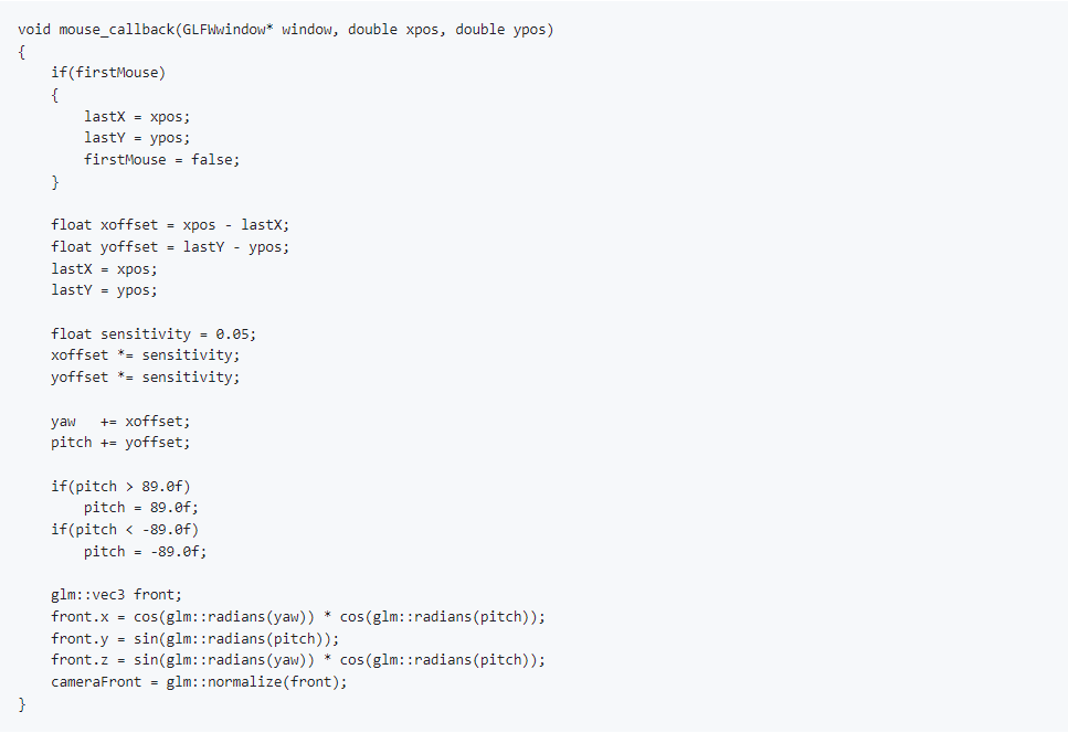 目前为止,我们实现了在世界中水平自由移动了,但是我们还不能转头也不能抬头。我们只要改变我们观察点的位置即可。这里,为了保证我们的焦距是不变的,所以我们要将front向量标准化。