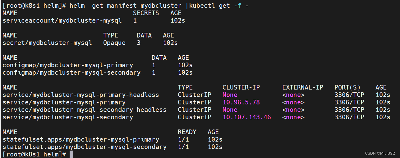 - mysql -h mydbcluster-mysql-primary.default.svc.cluster.local -uroot -p"$MYSQL_ROOT_PASSWORD"