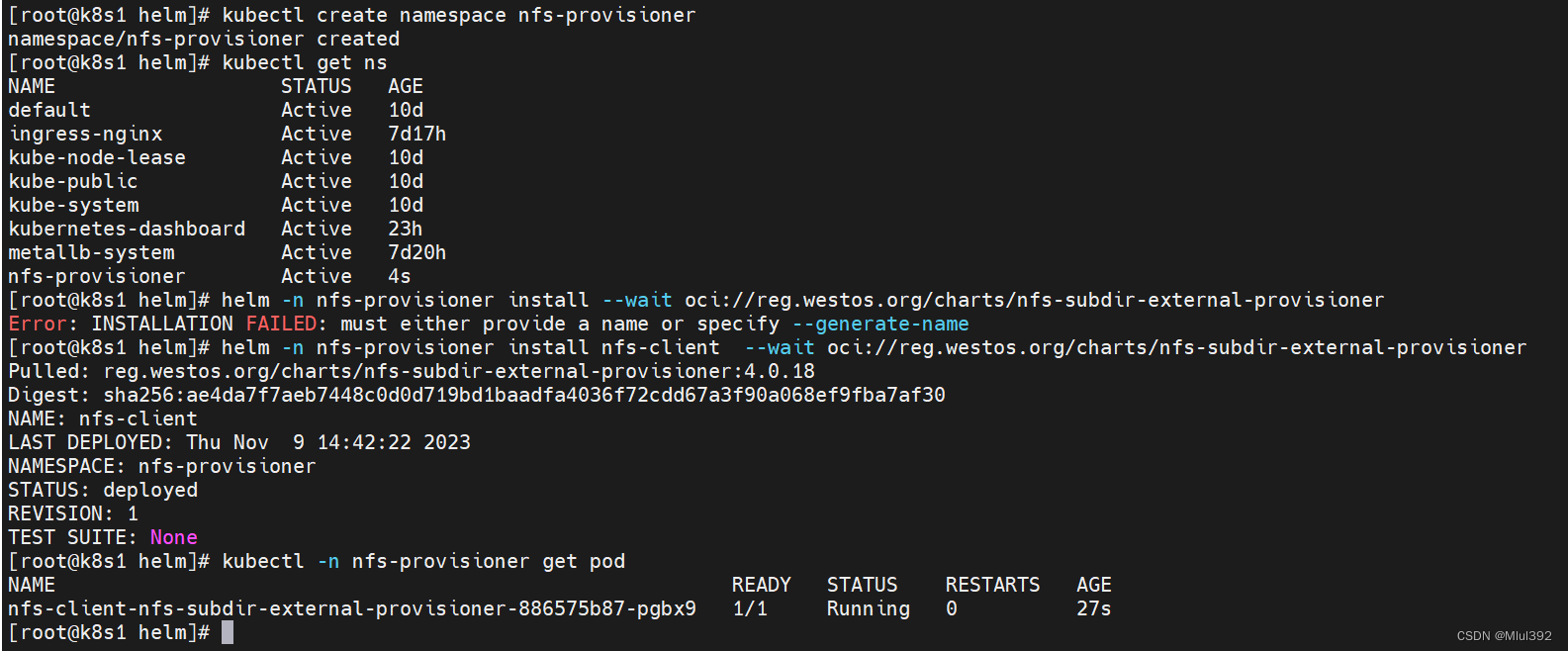 - helm -n nfs-provisioner install nfs-client --wait oci://reg.westos.org/charts/nfs-subdir-external-provisioner