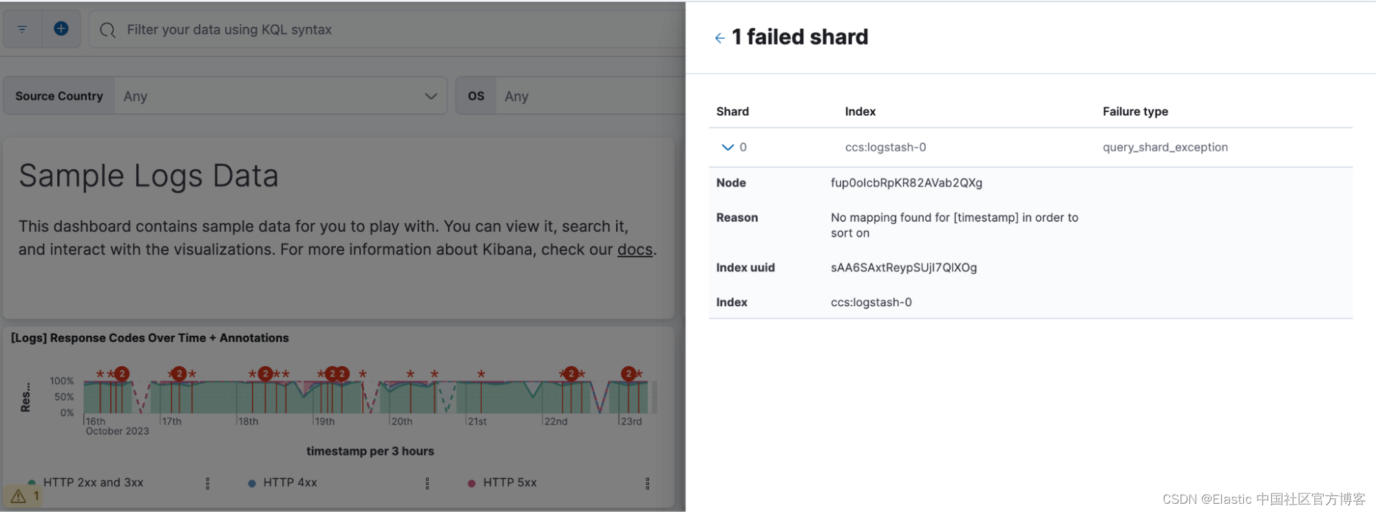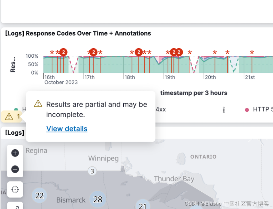 每个具有未 100% 返回没有问题的搜索的可视化都会有一条警告,该警告也直接链接到检查器的 “Clusters and shards” 选项卡。