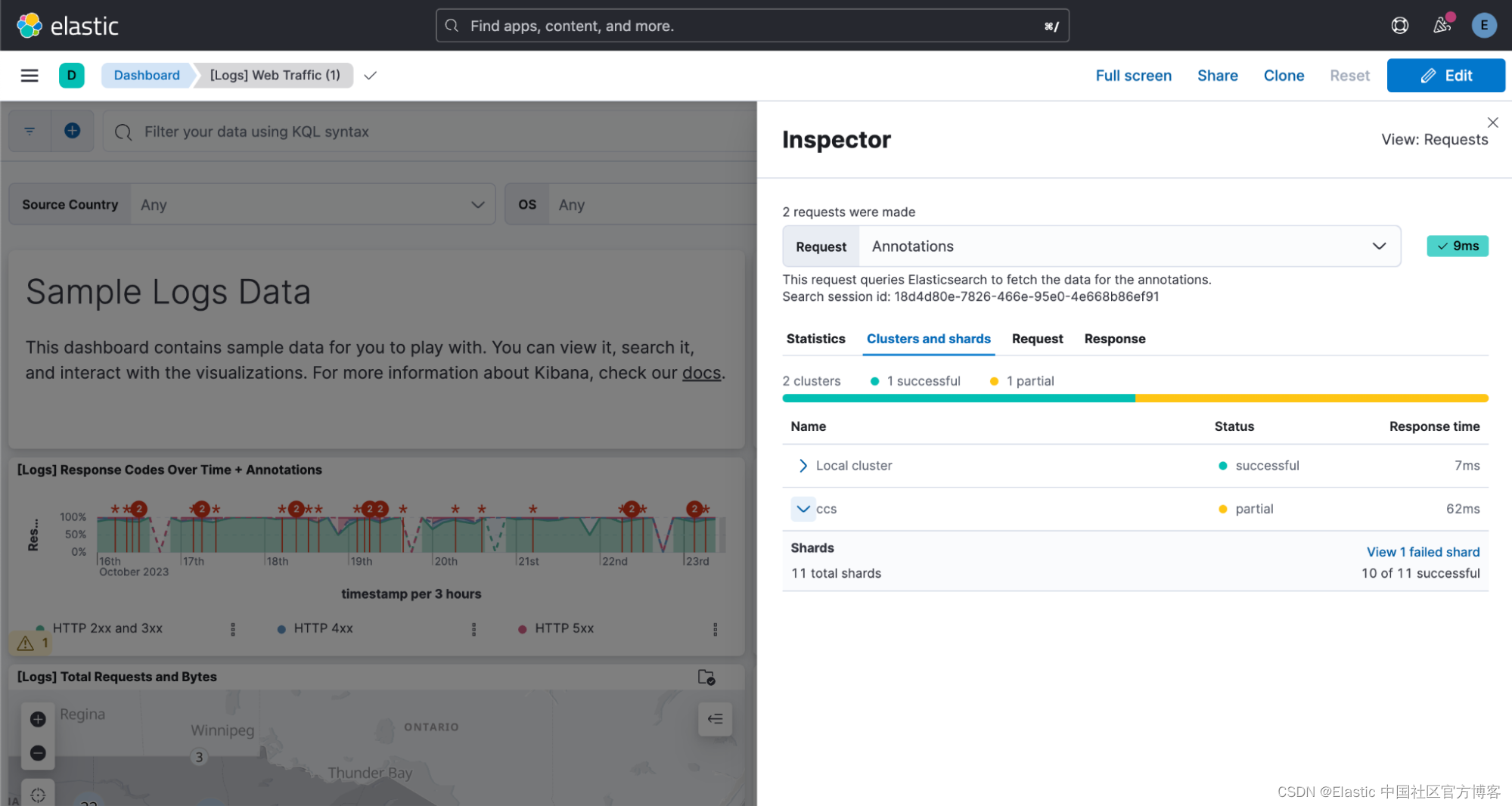 跨集群搜索 (CCS) 是跨多个集群统一数据的好方法,这些集群可以分布在世界各地和不同的环境中。 我们希望它尽可能频繁地提供完整的搜索结果,但也许某些远程集群的日子不好过。 只要有可能,我们仍然会返回部分结果,但是你怎么知道缺少什么,以及哪些集群有什么错误? 8.11 带来了额外的搜索响应计数信息,现在我们可以在 Kibana 的检查器中轻松找到它。