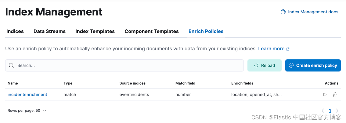 为了支持我们新的 ES|QL 功能,我们在索引管理体验中添加了丰富策略(enrich policies)。 用户现在可以从这里创建他们的丰富策略并立即开始使用它。 配置完成后,所有丰富策略都可在 “Enrich Policies” 选项卡中使用。 可以直接从 Index Management 中的 Enrich Policies 选项卡管理现有策略。