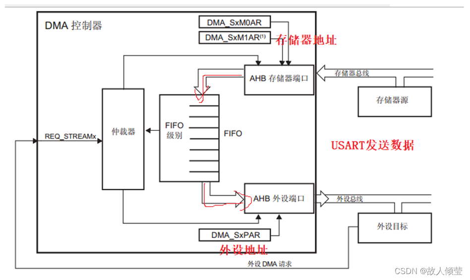 支持外设到存储器、存储器到外设和存储器到存储器(只能是DMA2上面的数据流来控制传输的常规通道(DMA搬运数据的三大方向)也支持在存储器方双缓冲的双缓冲区通道