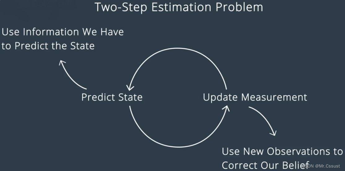 感知融合的一个基本算法是卡尔曼滤波,即模型预测和测量更新的无限循环,如下图所示: