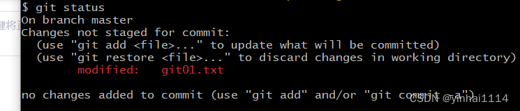 修改git01.txt文件,可以查看属性 提示暂为被加到缓冲区