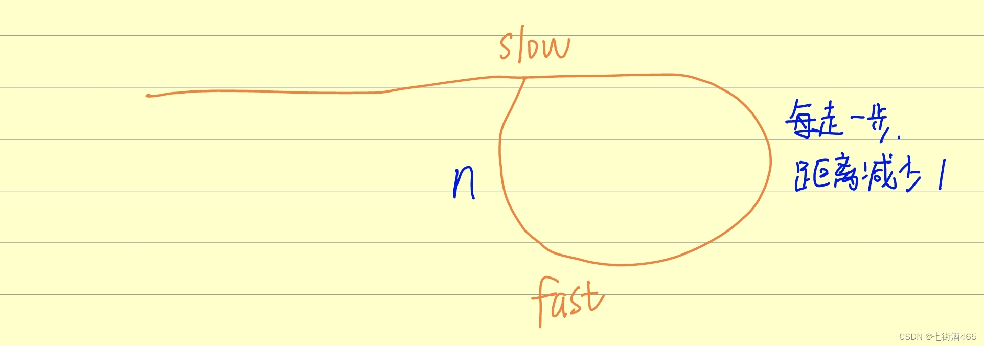 我们定义fast一次走两步,slow一次走一步,如果有环fast肯定先进环一直在换里面转,当slow进环的时候两个指针距离相差为N,而fast和slow每走一步,距离就减少1,总会存在,距离为0的情况,当fast=slow的时候,存在环,否则不存在;