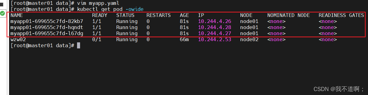 node01 node02两个节点都有www标签,所以01 02再统一拓扑域,但是pod亲和性的硬限制在kubernetes.io/hostname为node02的节点,我这里node节点太少看不出效果,正常同一拓扑域中大多会包含多个node节点,当我们选择完拓扑域后还可以再通过pod的亲和性选择指定的节点