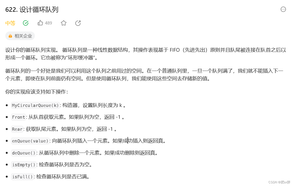 1. MyCircularQueue(k): 构造器,设置队列长度为 k