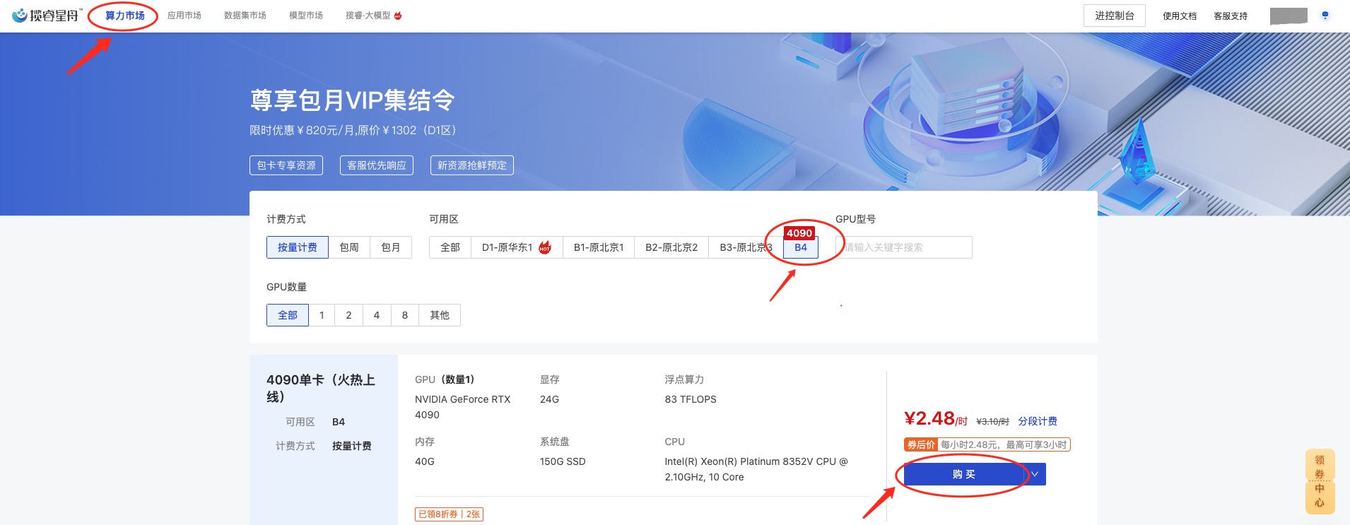 点击「算力市场」,选择「B4」区,选择一台 4090 的机器进行购买。