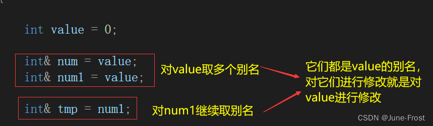 可以为一个变量创建多个引用,每个引用都是这个变量的别名,也可以对别名继续取别名。