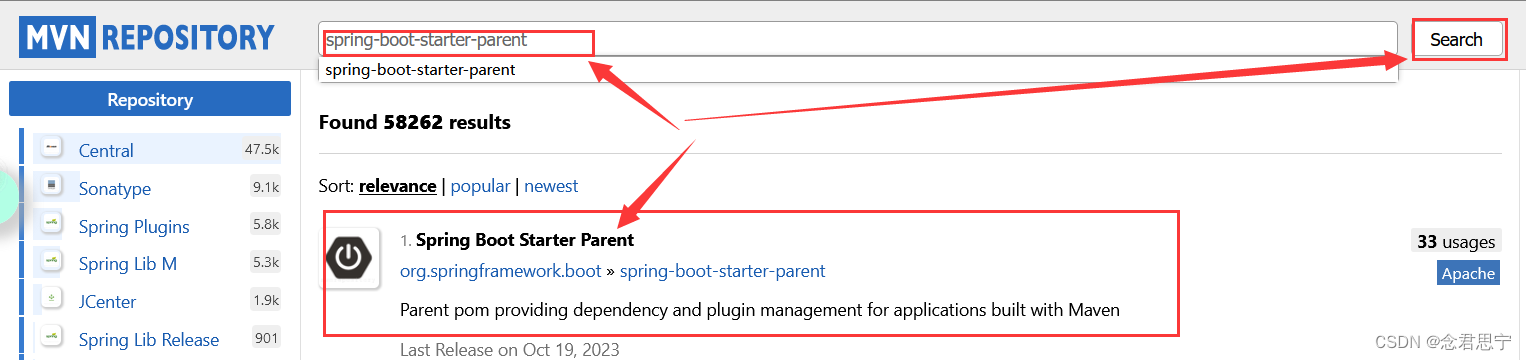 因此,我们在Maven中搜索:spring-boot-starter-parent