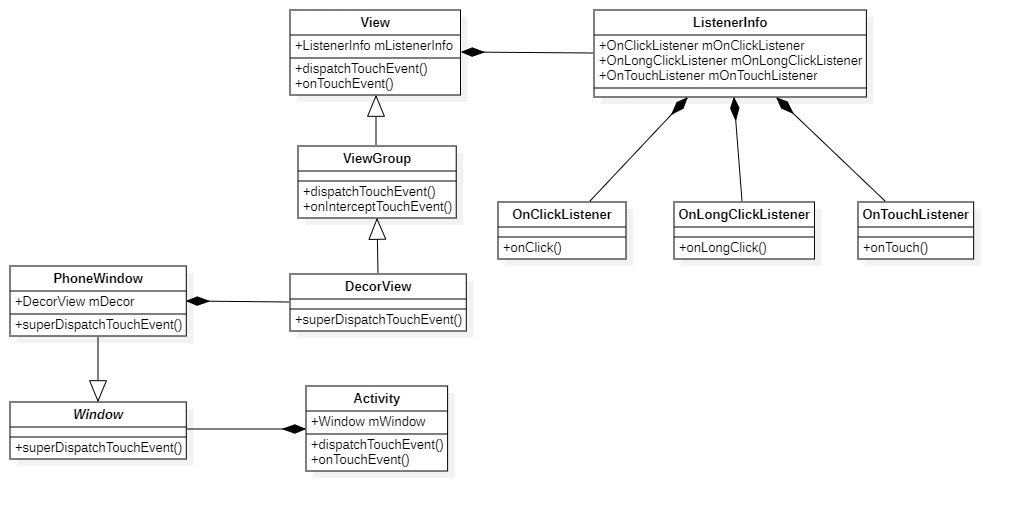 View可以设置事件监听,用于监听onTouch事件的回调,当然,像我们常见的onClick()、onLongClick()等事件也可监听,其相关源码如下: