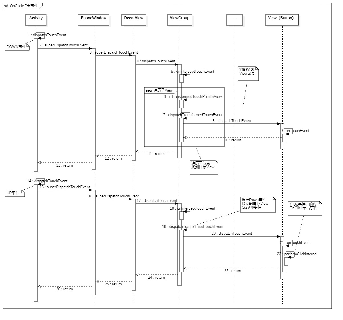 如下是Android的点击事件时序图,如果能够理解单击事件的由来,对于整个事件分发的知识要点已大体掌握。