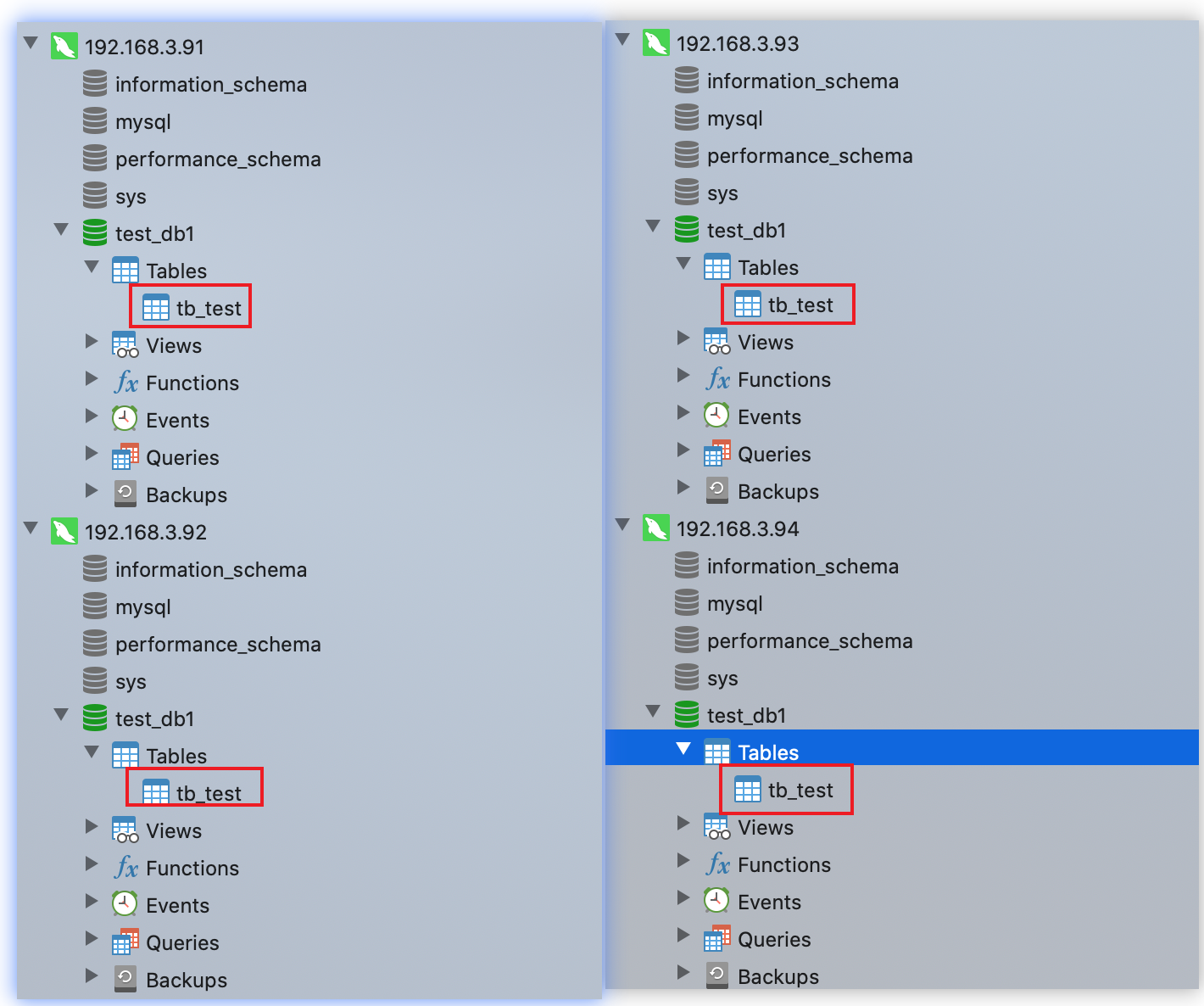 说明1:我们在192.168.3.91的master1主库上创建了数据库test_db1,然后再slave1,和master2,slave2上立刻就复制创建了test_db1出来