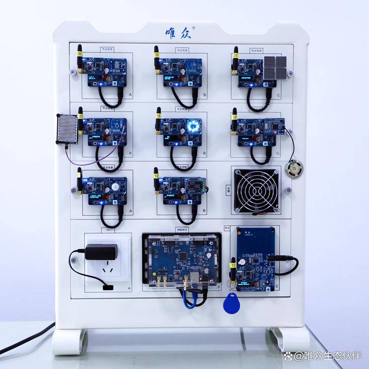 这是一款按照物联网技术架构开发的多功能综合教学实训平台,包含感知层、网络层、应用层,以智能家居、智慧农业、智能交通、智慧安防为案例,提供一个学习物联网底层硬件、业务原理和应用开发的实训环境。