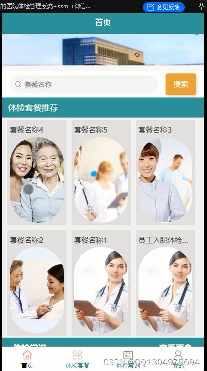 首页模块展示有体检套餐搜索框,健康攻略,以及热门医院展示等。