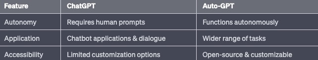 ChatGPT 和 Auto-GPT 的区别、自治性、应用性和可访问性