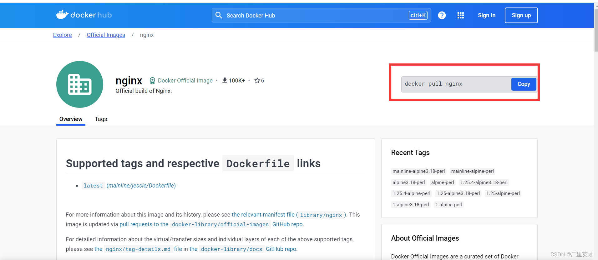 我们从DockerHub上即可找到所需的镜像资源,如下,以nginx为例: