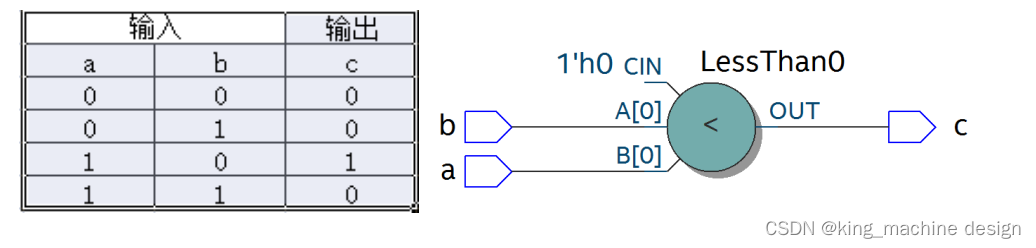 在 verilog 中以大于“>”,等于”==”,小于”<”,大于等于”>=”,小于等于”<=”,不等于”!=”表示,以大于举例,如 c= a > b ;表示如果 a 大于 b,那么 c 的值就为 1,否则为 0。真值表如下:
