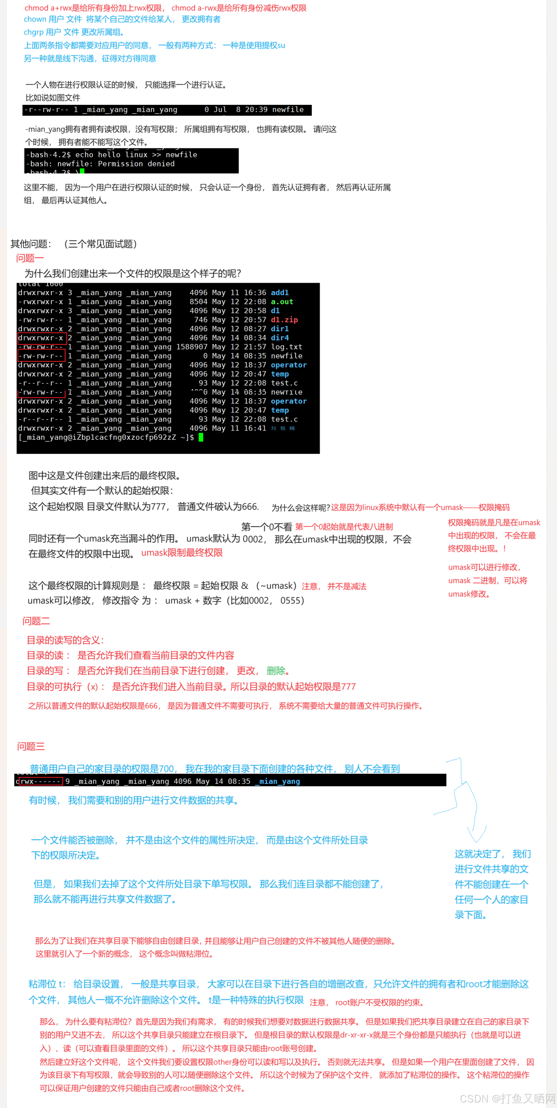 前言:本节内容主要讲述的是linux权限相关的内容, linux的权限如果使用root账号是感受不到的, 所以我们要使用普通账号对本节相关内容进行学习,以及一些实验的测试。 然后, 通过linux权限的学习我们可以知道为什么有时候我们对一个文件进行操作的时候总是permission dinied, 以及让我们知道根目录下的文件权限和我们普通用户家目录下的文件的权限的区别。
