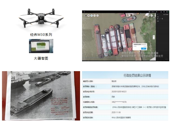 5.飞机返航,照片导入大疆智图生成二维正射影像,标注时间和地理坐标位置,并测量每一档船舶的超宽数据。