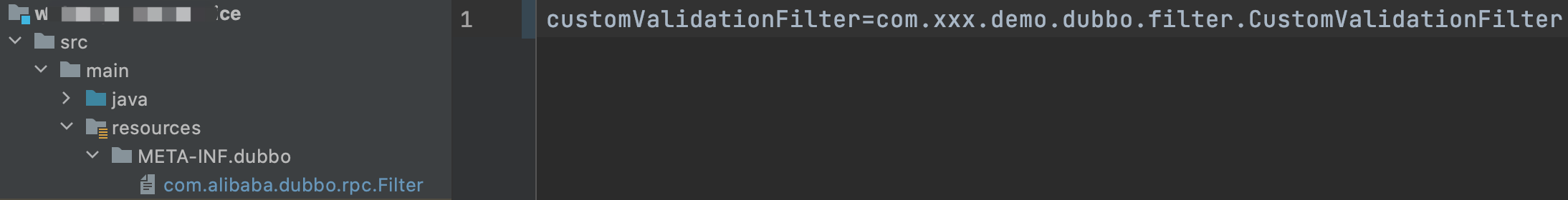 c. 文件中配置内容为:customValidationFilter=com.xxx.demo.dubbo.filter.CustomValidationFilter。
