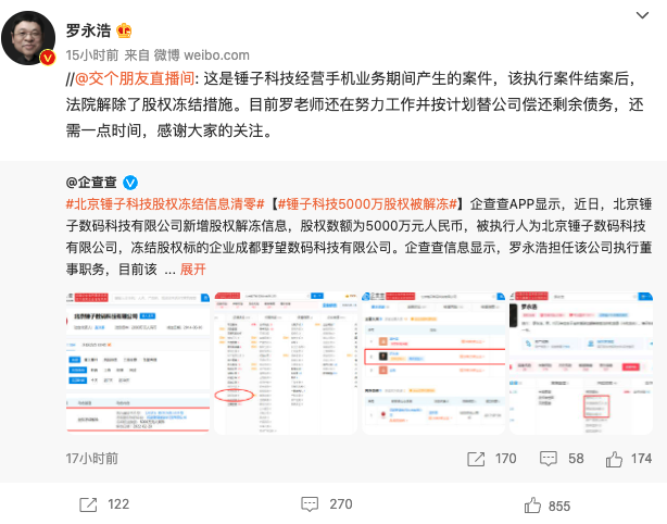 昨日晚间,罗永浩转发“交个朋友直播间”在微博的回应:“这是锤子科技经营手机业务期间产生的案件,该执行案件结案后,法院解除了股权冻结措施。目前罗老师还在努力工作并按计划替公司偿还剩余债务,还需一点时间,感谢大家的关注。”