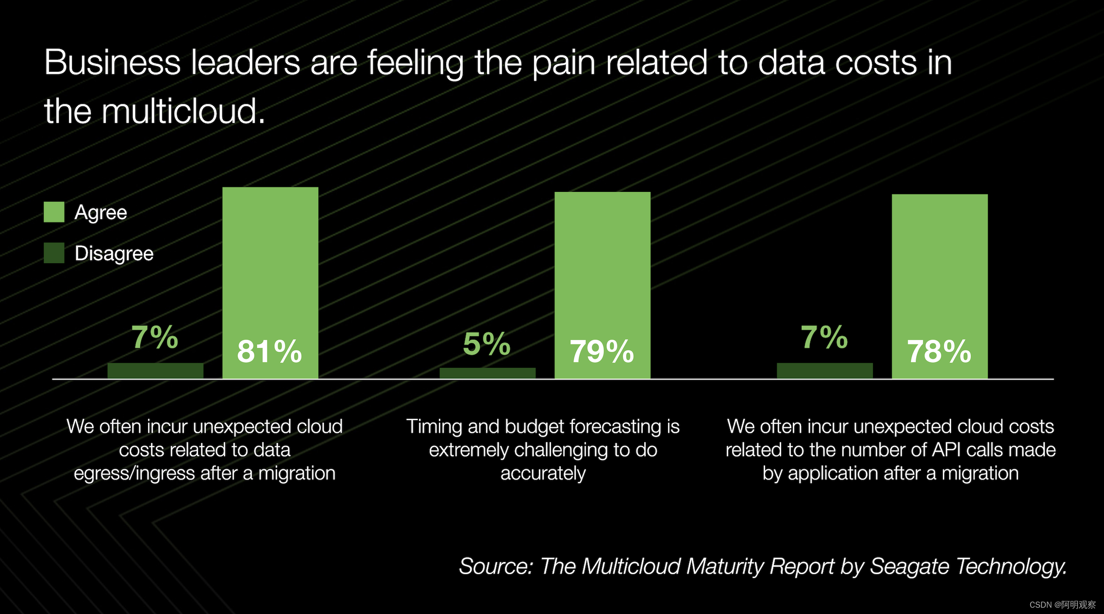 令人惊讶的是,在《多云成熟度报告》调查中,81%的领导者表示,他们经常会在迁移后产生与数据进出相关的意外云成本。79%的人表示,准确地进行时间安排和预算显得非常困难。78%的人称,他们经常会因迁移后应用程序API调用数量而产生意外的云成本。