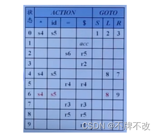 特别地,要将填写 a c t i o n [ 包 含 S ′ → S ⋅ 的 项 目 集 的 编 号 , $ ] action[包含 S'\rightarrow S· 的项目集的编号,\$] action[包含S′→S⋅的项目集的编号,$] 为 a c c acc acc,表示到达接受状态。
