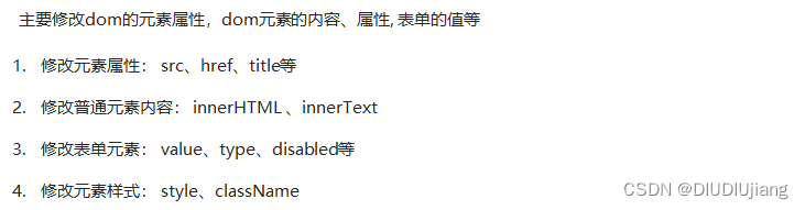 关于dom操作,我们主要针对于元素的操作。主要有创建、增、删、改、查、属性操作、事件操作。