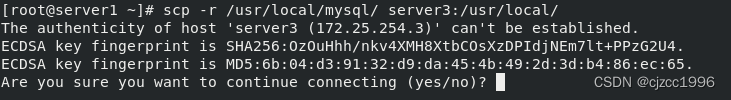 在上文操作的基础上,首先我们需要再在一个新的虚拟机上安装设置mysql,将server1上编译好的包拷贝到server2上: