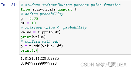 Running the example returns the value of about 1.812 or less that covers 95% of the observations from the chosen distribution. The probability of the value is then confirmed (with minor rounding error) via the CDF.