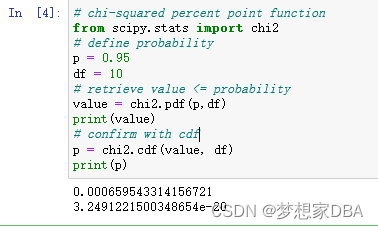 Running the example first calculates the value of 18.3 or less that covers 95% of the observations from the distribution. The probability of this observation is confirmed by using it as input to the CDF.