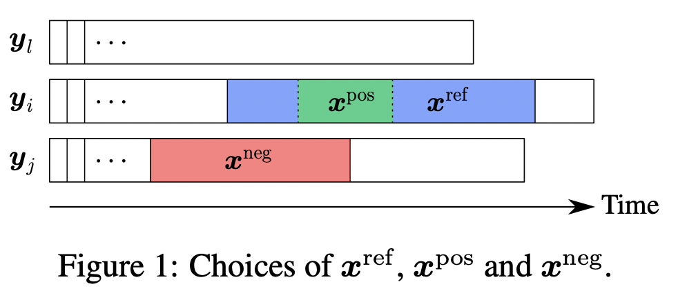 本文的时间序列表示学习方法思路来源于经典的词向量模型CBOW。CBOW中的假设是,一个单词的上下文表示应该和该单词的表示比较近,同时和其他随机采样的单词表示比较远。本文将这种思路应用到时间序列表示学习中,首先需要构造CBOW中的上下文(context)和随机负样本,构造方法如下图所示。首先选择一个时间序列xref,以及xref中的一个子序列xpos。,xref可以看成是xpos的context。同时,随机从其他时间序列,或者当前时间序列的其他时间片段中采样多个负样本xneg。这样就可以构造类似CBOW的损失函数了,让xref和xpos离得近,同时让xref和其他负样本xneg距离远。