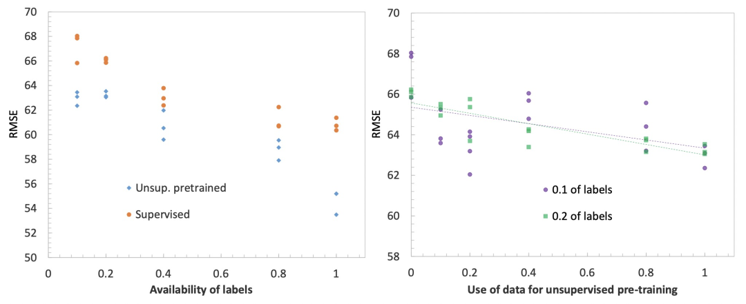 下图展示了无监督预训练时间序列模型对时间序列预测任务带来的效果提升。左侧的图表示,不同有label数据量下,是否使用无监督预训练的RMSE效果对比。可以看到,无论有label数据量有多少,增加无监督预训练都可以提升预测效果。右侧图表示使用的无监督预训练数据量越大,最终的时间序列预测拟合效果越好。