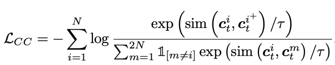 Contextual Contrasting则是序列整体的对比学习,拉近相同序列生成的两个view的距离,让不同序列生成的view距离更远,公式如下,这里和图像对比学习的方式类似: