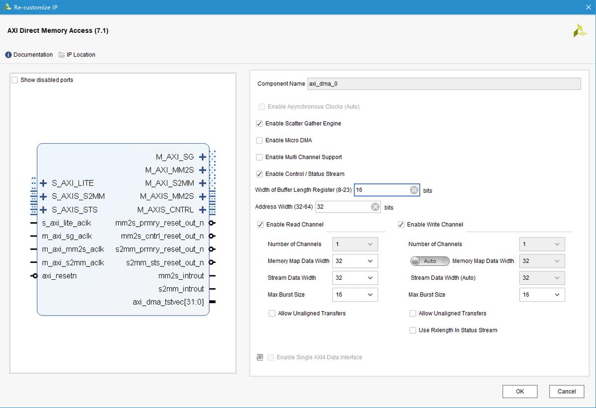 AXI DMA(AXI Direct Memory Access) IP核开发文档为产品资料“6-开发参考资料\Xilinx官方参考文档\”目录下的《pg021_axi_dma.pdf》,具体配置说明如下。