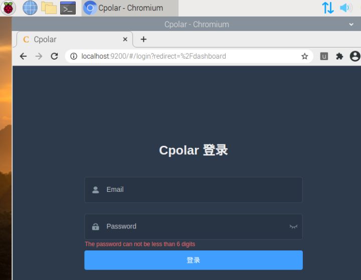 树莓派重启后,我们可以直接打开浏览器,在浏览器地址栏内输入“localhost:9200”,就能在树莓派本地看到cpolar的图形化界面。