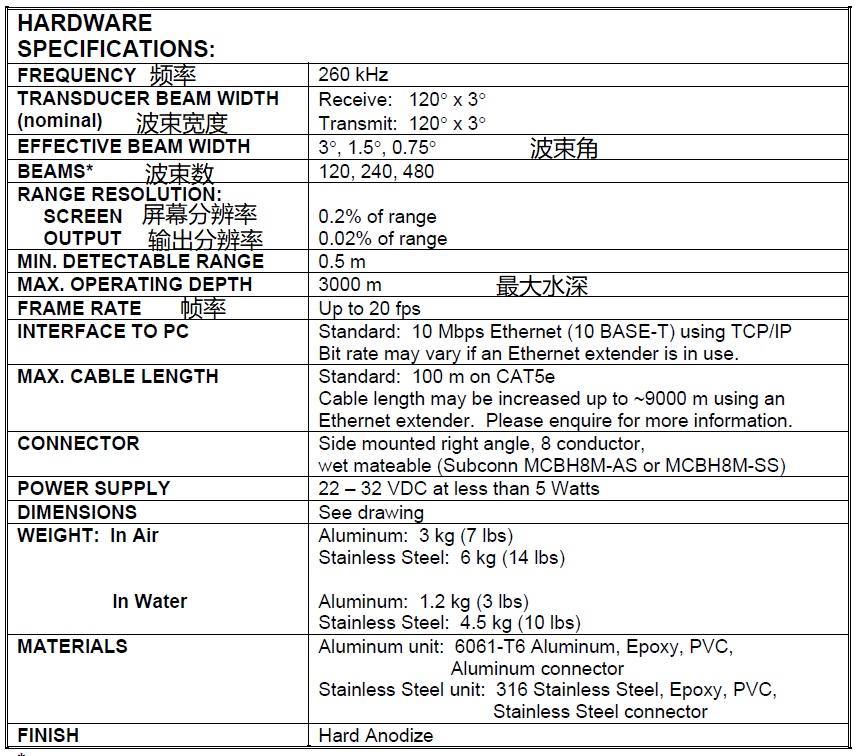 此种安装于ROV上的多波束剖面声呐不同于浅地层剖面仪,仅可以扫描某一剖面上海床表面的起伏变化,无法探测海床面以下的土壤分层信息。下图是Imagenex公司的837A多波束剖面声呐。Imagenex 837A型“Delta T”是一种多接收器声纳系统,旨在提供具有水下声纳所有优点的视频成像。创新的数字信号处理用于优化所有通道的数据使用,以在视场中的每个点实现最佳分辨率。计算能力的最新进展使得以与计算机监视器分辨率相同的分辨率传输和处理这些数据成为可能,并且图像帧速率优于每秒20帧。