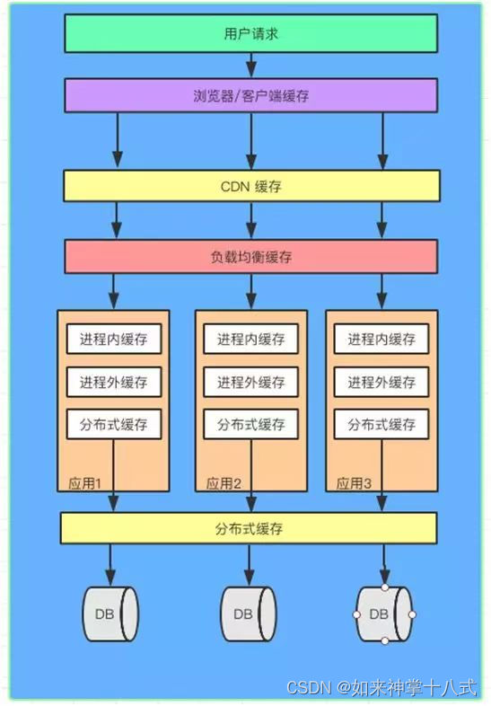 从用户请求数据到数据返回,数据经过了浏览器,CDN,代理服务器,应用服务器,以及数据库各个环节。每个环节都可以运用缓存技术。