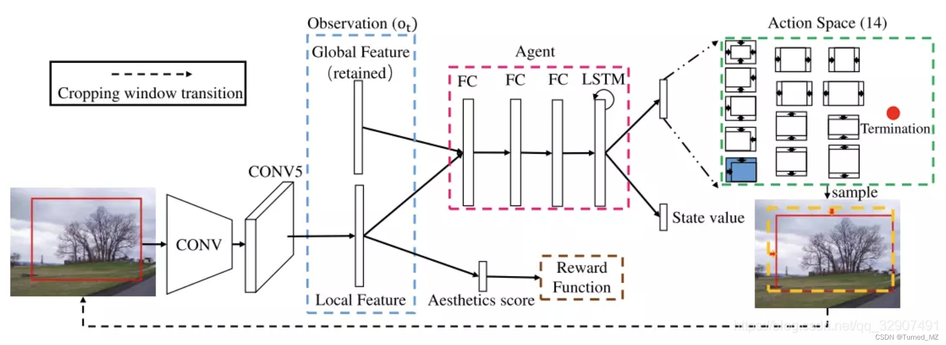 除了基于显著图预处理的方案之外,还可以使用基于增强学习的方案,比如A2RL框架,可以更加高效的搜索裁剪框,如下图: