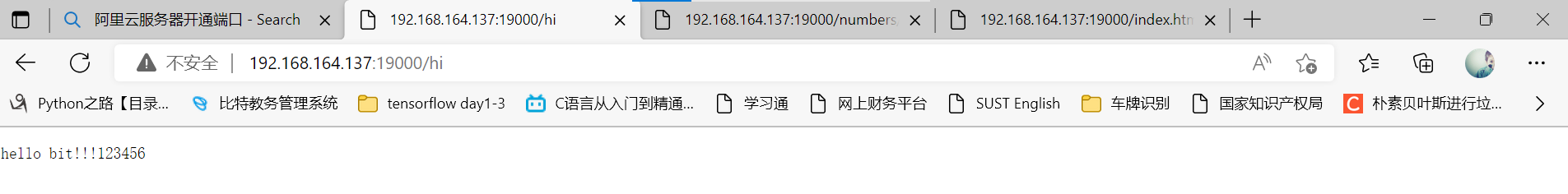 浏览器输入192.168.164.137:19000/hi,页面显示hello bit!!!123456,如下图所示: