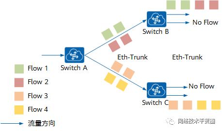 如图1-4所示,Switch A的入接口有4种流量,出接口为2条等价链路,经Hash计算,流量1和流量2走上面的链路到Switch B;流量3和流量4走下面的链路到Switch C。在Switch B出接口同样为2条等价链路,若采用与Switch A相同或者类似的Hash算法,其Hash的结果将为流量1和流量2走上面的链路,而下面的链路没有流量。Switch C的情况类似。这种经过多次Hash后,ECMP或者Eth-Trunk各成员口之间流量极度不均匀的现象称为Hash极化。
