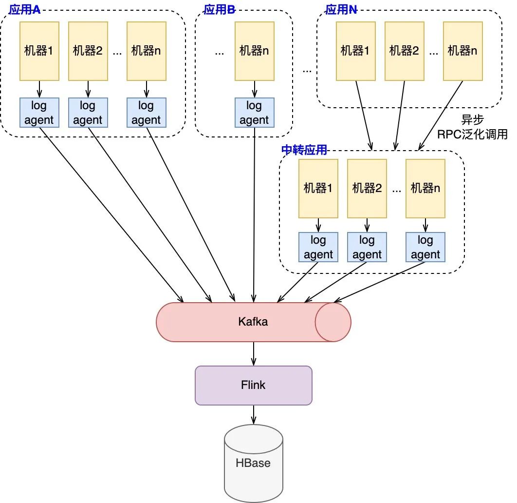 日志收集:各应用服务通过机器上部署的log_agent收集异步上报的日志数据,并统一传输至Kafka通道中,此外针对少量不支持log_agent的服务,搭建了如图所示的中转应用。