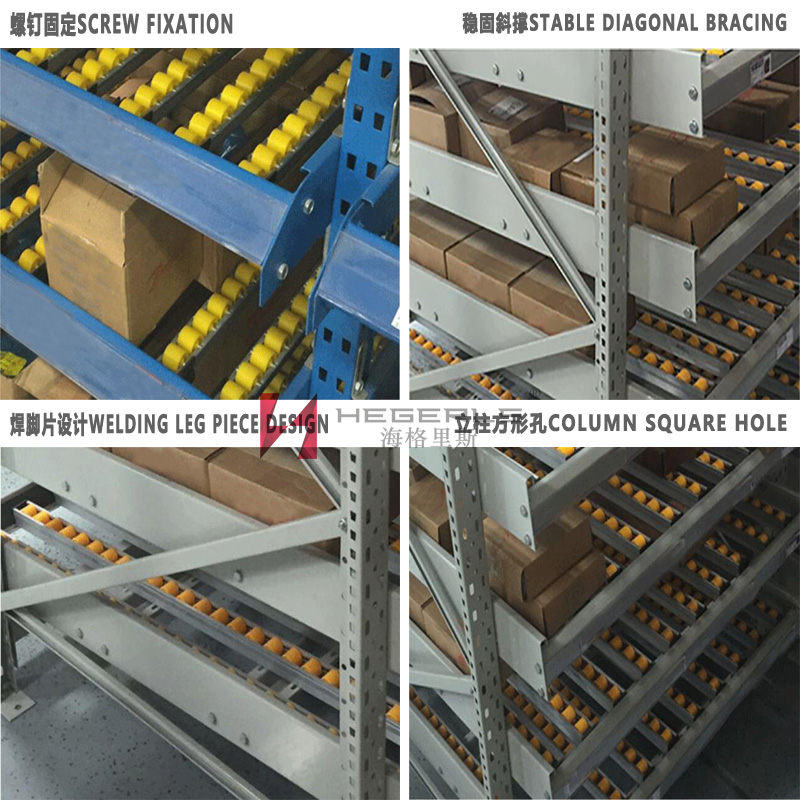 采用滚轮式铝合金等流利条,利用货物自重实现货物的先进先出,货物从货架的背后放入,前面取出。并可实现一次补货,多次取货。