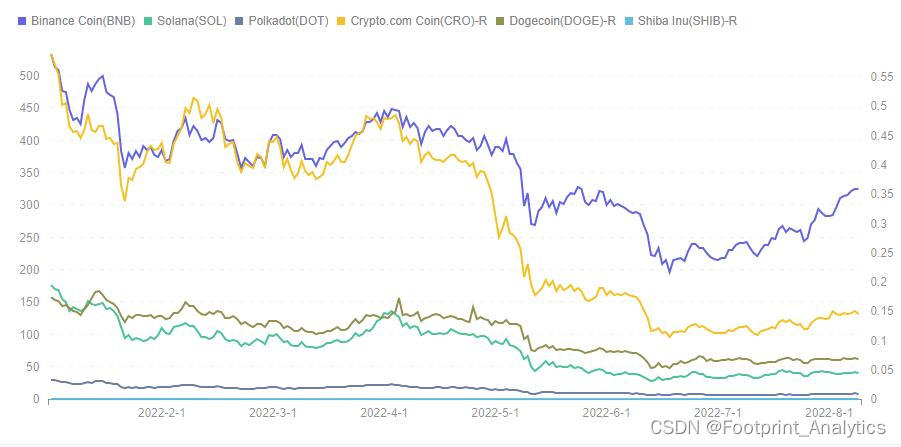 从 2022 年 DOGE 和 SHIB 每月市值排名中可以看出,在相当一段时间内,SHIB 的市值甚至始终保持在前 15 名内的位置。